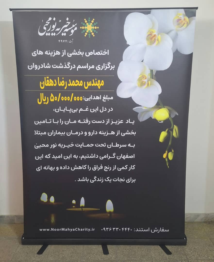 در صورتی که مایل هستید بخشی از هزینه برگزاری مراسم هفتم، چهلم ، سالگرد درگذشت عزیز از دست رفته خود را به پرداخت هزینه دارو و درمان بیماران مبتلا به سرطان اختصاص دهید می توانید با سفارش این استند هم موجب شادی روح آن عزیز و هم در نجات جان یک بیمار مبتلا به سرطان سهیم شوید.